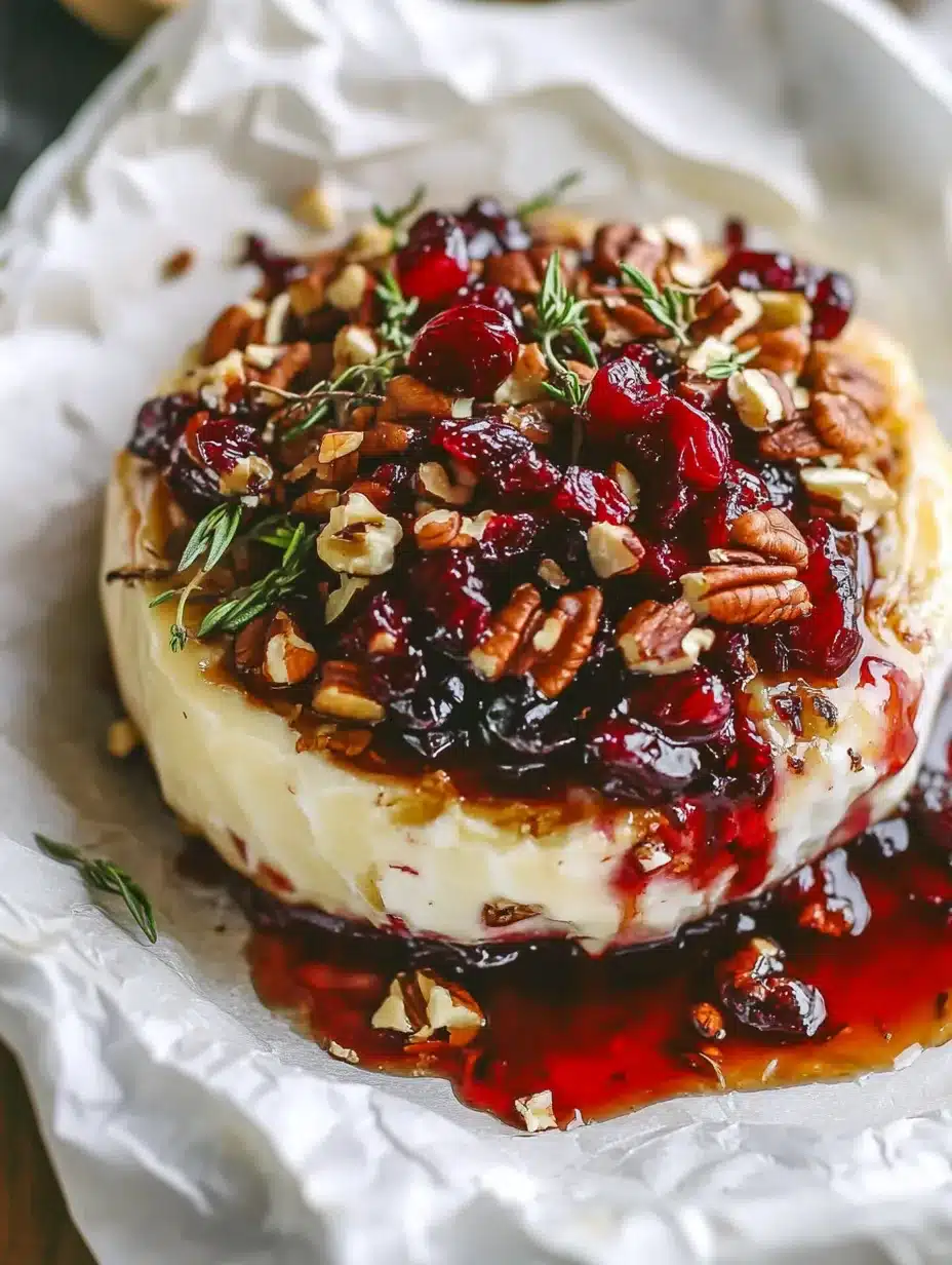 4. Add the Topping: Spoon the cranberry and pecan mixture over the brie.