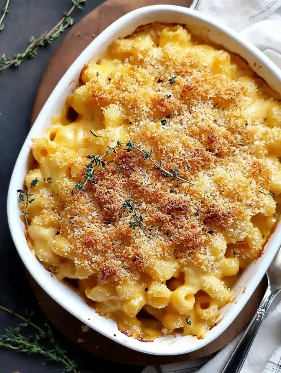 7. Assemble the Dish: Transfer the mac and cheese mixture into a greased baking dish. Sprinkle the thyme crumb topping evenly over the top.